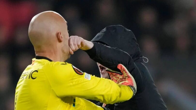 Throughout a Europa League recreation on Thursday, an irate fan stormed the sphere and punched a participant within the face and his reward was being hauled exterior by safety after receiving a savage proper hand. Over the past minutes of play, the fan attacked Dmitrovic within the face earlier than being pulled to the bottom by the Serbian.