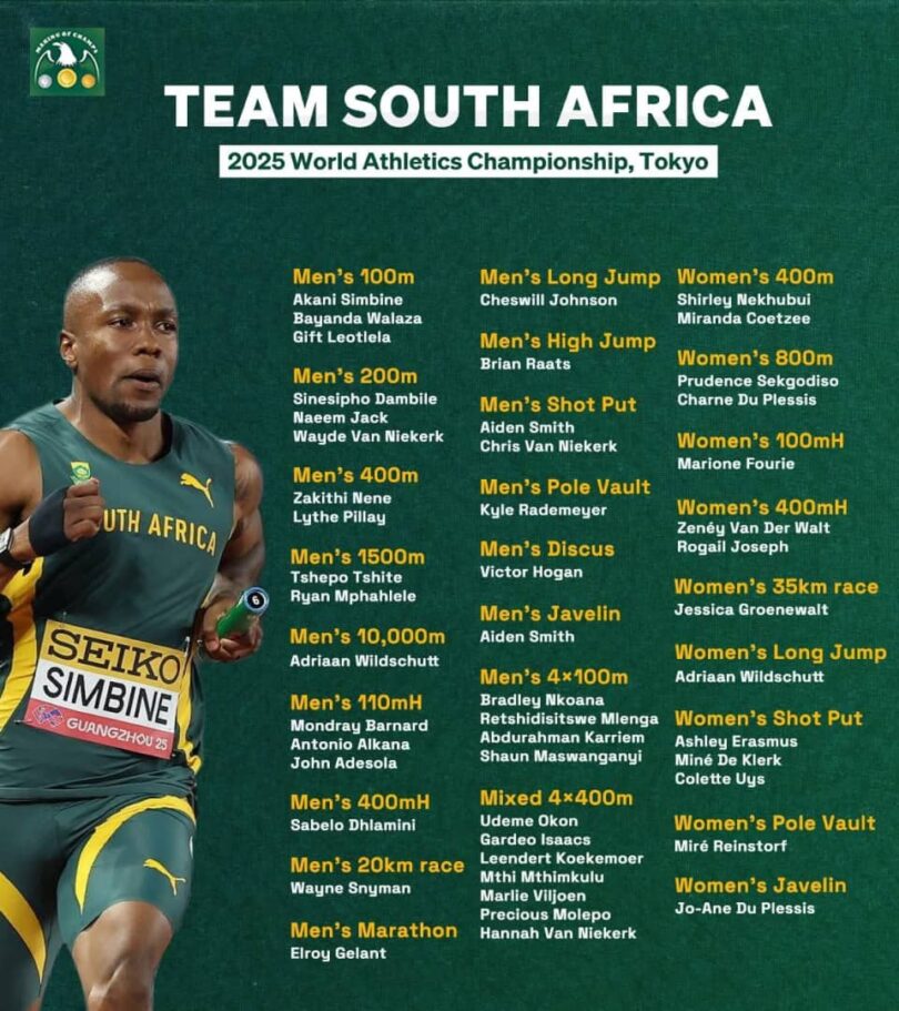 Within the males’s 100m, Akani Simbine leads alongside Bayanda Walaza and Present Leotlela, whereas Wayde van Niekerk returns to headline the 200m crew with Sinesipho Dambile and Naeem Jack.