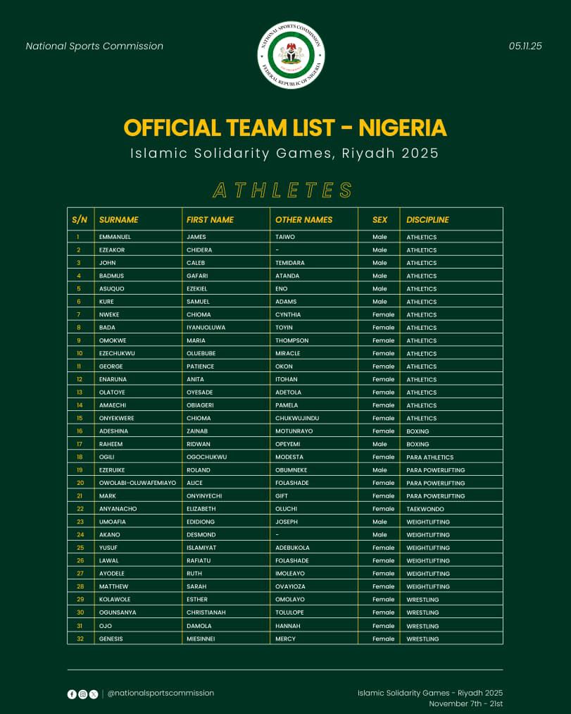 The Nationwide Sports activities Fee has formally launched the listing of athletes and officers who will symbolize Nigeria on the 2025 Islamic Solidarity Video games in Riyadh, Saudi Arabia, scheduled to happen from November 7 to 21.