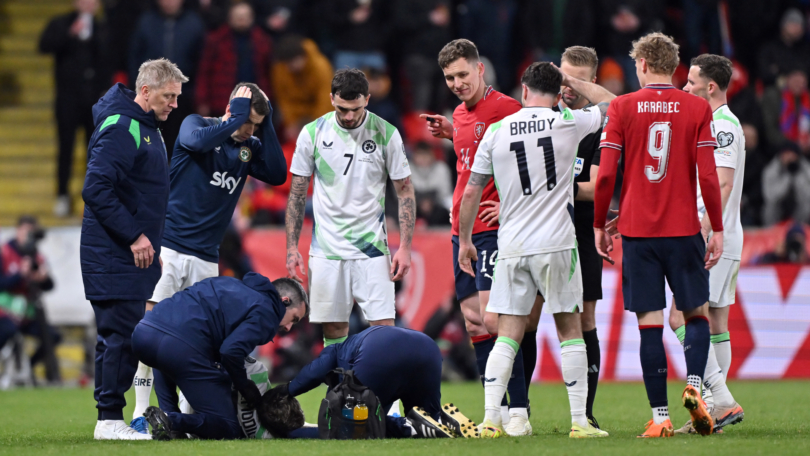 He was put into the recovery position as the stadium fell into silence, before eventually leaving the pitch on a stretcher to a standing ovation, where he was replaced by Harvey Vale for his Ireland debut.
