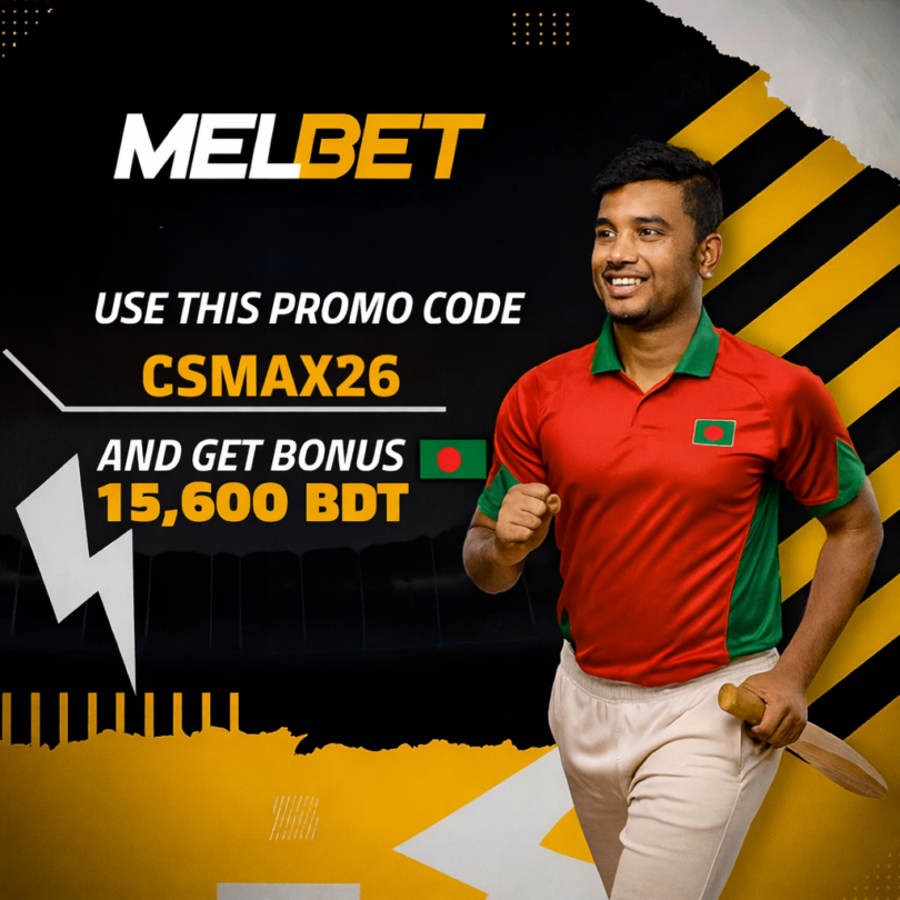 Enter CSMAX26 when you register at Melbet. This unlocks the updated 2026 welcome offers: 1300% Sports Bonus up to 15,600 BDT or the 450% Casino Pack up to 315,000 BDT + 250 Free Spins.