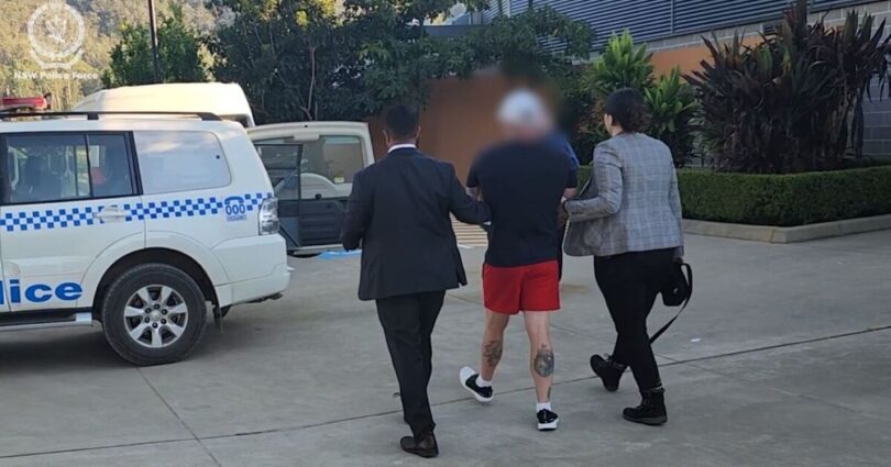 Detectives attended a property at Bucca, north of Coffs Harbour just before 7.30am on Tuesday, April 14, 2026. Footage shared by police showed the tattooed man in handcuffs, being led into a police vehicle.