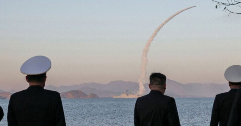 Pyongyang’s forces fired two strategic cruise missiles and three anti-ship missiles as Kim watched on alongside defence officials and naval commanders.
