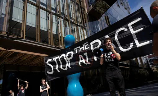 AI safety researcher Michael Trazzi speaks to a crowd of protesters outside of the OpenAI headquarters before marching to the office of xAI, calling for a pause in AI development, in San Francisco, California, (REUTERS)