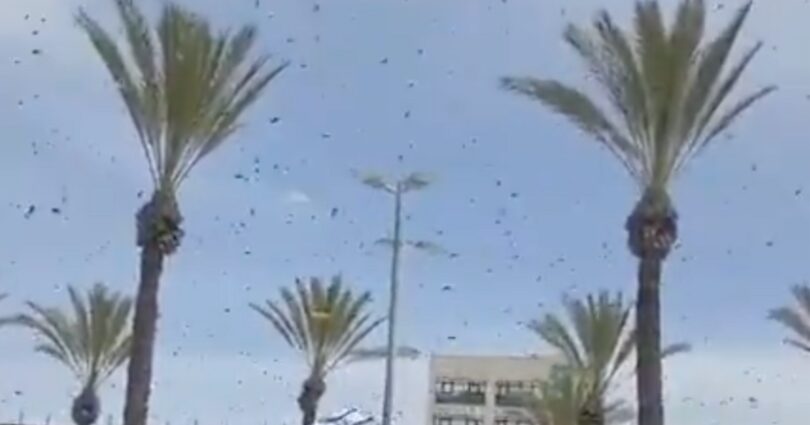 Shocking video footage posted online shows the insects descending upon the commercial centre of Netivot, in southern Israel on Wednesday.