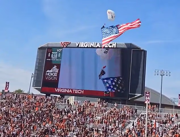 Virginia Tech officials said on social media on Saturday: ‘We are grateful to report that the skydiver was safely secured and is currently stable. Our primary focus remains on their well-being.