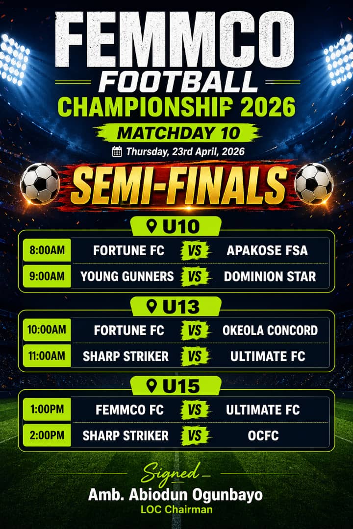 The stage is set for an exciting round of semi-final clashes at the Femmco Football Championship 2026, as Matchday 10 promises high-stakes action across all categories on Thursday, April 23, at the NUD Playing Ground, Olose.