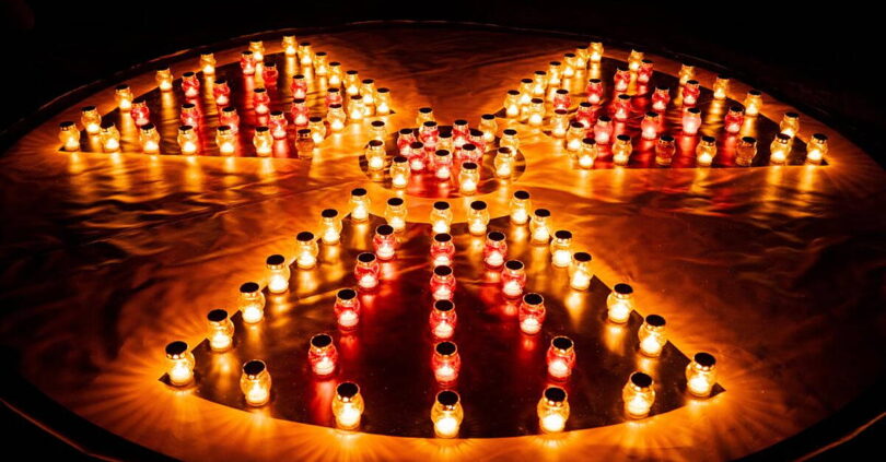 Three people in hazmat suits holding candles